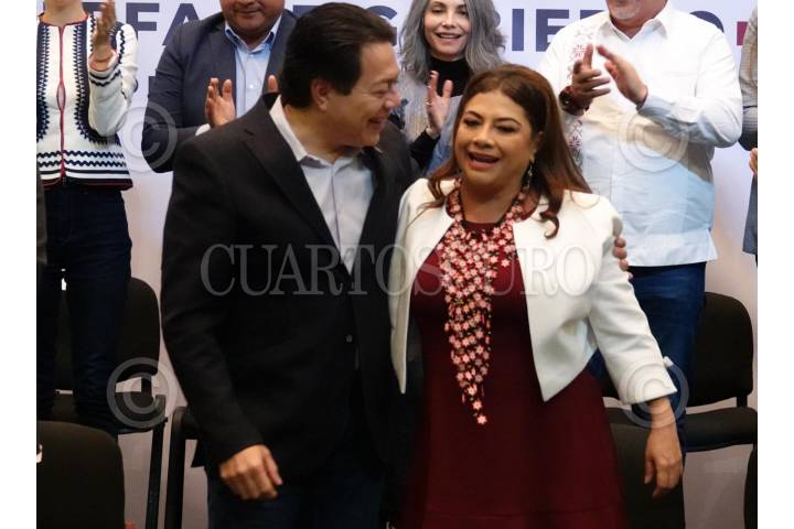 CIUDAD DE MÉXICO, 10DICIEMBRE2023.- Mario Delgado, presidente Nacional de Morena, y Clara Brugada, precandidata a la Jefatura de Gobierno por Morena, se abrazaron durante la presentación de su equipo de precampaña en el Club de Periodistas. FOTO: GRACIELA LÓPEZ /CUARTOSCURO.COM