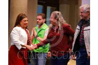 CIUDAD DE MÉXICO, 10DICIEMBRE2023.- Clara Brugada, candidato a la Jefatura de Gobierno de Morena, saluda a Ana Francis Mor, diputada local de Morena, y Rafael Barajas Durán "El Fisgón", responsable de la formación política y consultas ciudadanas, durante la presentación del equipo de la ex alcaldesa en el Club de Periodistas. FOTO: PRENSA CLARA BRUGADA/CUARTOSCURO.COM