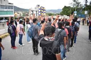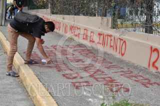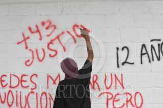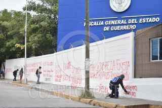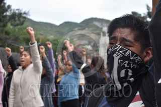 CHILPANCINGO, GUERRERO, 10DICIEMBRE2023.- En un segundo día de actividades, estudiantes de la Escuela Normal Rural ‘Raúl Isidro Burgos’ de Ayotzinapa, junto con estudiantes de las escuelas normales que integran la Federación de Estudiantes Campesinos Socialistas de México (FECSM), realizaron un mitin político al exterior de las instalaciones de la Fiscalía General del Estado (FGE) de Guerrero, para recriminar la participación de policías ministeriales en los hechos ocurridos el 12 de diciembre del 2011 en la autopista del Sol. Recordaron que en esa fecha, sus compañeros Jorge Alexis Herrera Pino, originario de Atoyac, y Gabriel Echeverría de Jesús, oriundo de Tixtla, perdieron la vida por las balas provenientes de policías ministeriales, quienes luego de los hechos, fueron los mismos agentes de la FGE quienes intentaron sembrar un rifle AK-47 (cuerno de chivo) a uno de los estudiantes, para así intentar culpar a los jóvenes del supuesto “enfrentamiento” en el punto conocido como el Parador del Marques, al sur de Chilpancingo. FOTO: DASSAEV TÉLLEZ ADAME/CUARTOSCURO.COM
