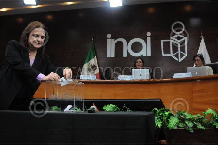 CIUDAD DE MÉXICO, 10DICIEMBRE2023. - La consejera del INAI, Norma Julieta del Río, coloca su cédula de votación en la urna, momentos antes había anunciado que votaría por Josefina Román. FOTO: DANIEL AUGUSTO /CUARTOSCURO.COM