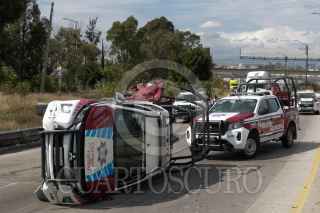 PUEBLA, PUEBLA, 15DICIEMBRE2023.- Una persecución por el robo de un trailer terminó con una patrulla volcada, tres civiles lesionados, un auto chocado y la detención de dos presuntos responsables. El suceso tuvo lugar en el Periférico Ecológico de la ciudad de Puebla. FOTO: MIREYA NOVO/CUARTOSCURO.COM
