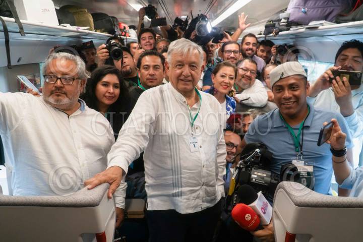 SAN FRANCISCO, CAMPECHE, 15DICIEMBRE2023.- Andrés Manuel López Obrador, presidente de México, se toma una fotografía junto a medios de comunicación durante su viaje en el Tren Maya en su inicio de operaciones. FOTO: PRESIDENCIA/CUARTOSCURO.COM