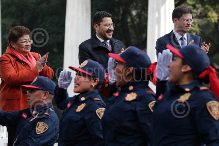 CIUDAD DE MÉXICO, 17DICIEMBRE2023.- Ernestina Godoy, Fiscal General de Justicia de la Ciudad de México; Pablo Vázquez Camacho, Secretario de Seguridad Ciudadana, y Martí Batres, Jefe de Gobierno, encabezaron el desfile del Día de la Policía y entrega de reconocimientos a elementos destacados en el Hemiciclo a Juárez. FOTO: GOBIERNO DE LA CIUDAD DE MÉXICO/CUARTOSCURO.COM