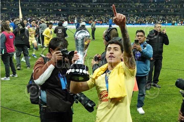 CIUDAD DE MÉXICO, 17DICIEMBRE2023.- Alejandro Zendejas, extremo derecho de las Águilas del América levanto la Copa al ganar 3-0 contra los Tigres en la Final de Apertura 2023 en el Estadio Azteca. FOTO: GRACIELA LÓPEZ/CUARTOSCURO.COM