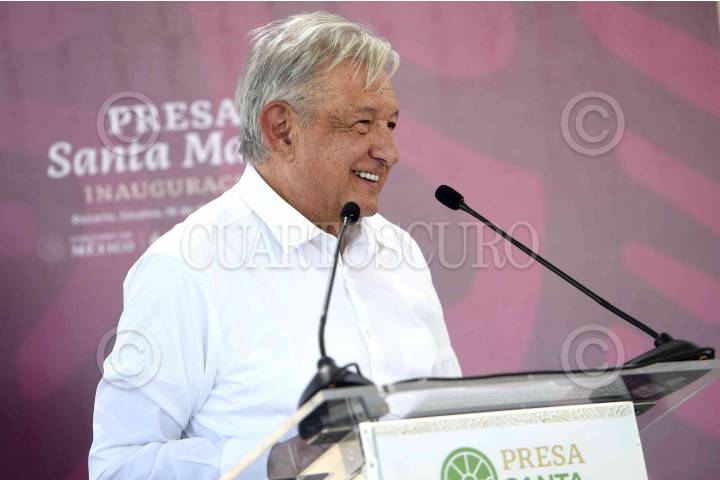 ROSARIO, SINALOA, 18DICIEMBRE2023.- Andrés Manuel López Obrador, Presidente de México, durante la inauguración de la Presa “Santa María”. FOTO: PRESIDENCIA/CUARTOSCURO.COM