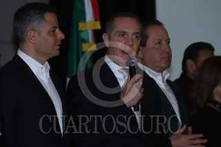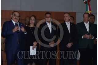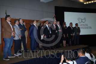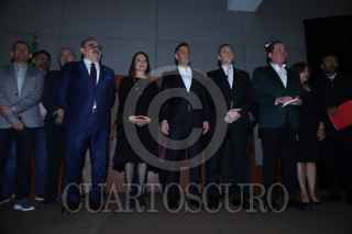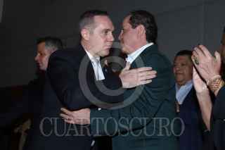 CIUDAD DE MÉXICO, 19DICIEMBRE2023. Adrián Rubalcaba y Erubiel Ávila se saludan durante la conferencia de prensa donde se dió a conocer la conformación de la agrupación política “Alianza Progresista”, que reúne a distintos actores políticos a favor de la precandidata presidencial de Morena, Claudia Sheinbaum. FOTO: EDGAR NEGRETE LIRA/CUARTOSCURO.COM