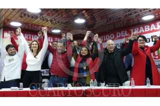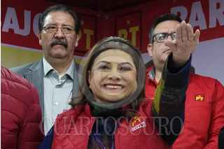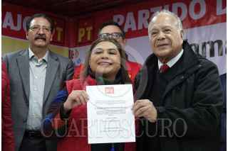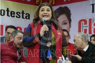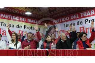 CIUDAD DE MÉXICO, 20DICIEMVRE2023.- Clara Brugada, precandidata por la Jefatura de Gobierno en la Ciudad de México, y Alberto Anaya, coordinador Nacional del Partido del Trabajo, conversaron durante el evento de la toma de protesta de la precandidata en las instalaciones de este partido. FOTO: GRACIELA LÓPEZ /CUARTOSCURO.COM