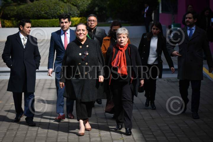 CIUDAD DE MÉXICO, 21DICIEMBRE2023.- Guadalupe Taddei, consejera presidenta del INE, y Alicia Bárcena secretaria de Relaciones Exteriores, durante su llegada a la firma de convenio entre la SRE y el INE para fortalecer el voto del mexicano en el exterior para el proceso electoral de 2024. FOTO: MARIO JASSO/CUARTOSCURO.COM