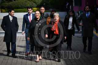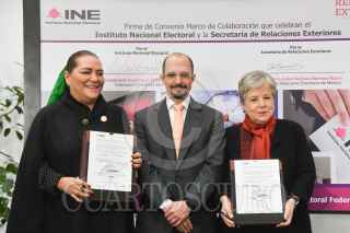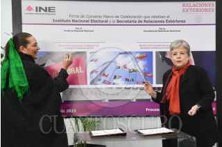 CIUDAD DE MÉXICO, 21DICIEMBRE2023.- Guadalupe Taddei, consejera presidenta del INE y Alicia Bárcena secretaria de Relaciones Exteriores, durante a la firma de convenio entre la SRE y el INE para fortalecer el voto del mexicano en el exterior para el proceso electoral de 2024. FOTO: MARIO JASSO/CUARTOSCURO.COM