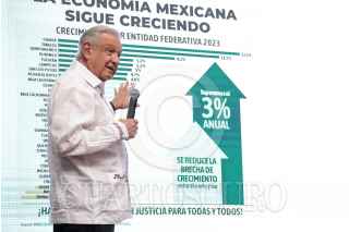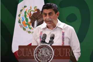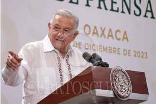 SALINA CRUZ, OAXACA, 22DICIEMBRE2023.- Andrés Manuel López Obrador, presidente de México, encabezó la conferencia de prensa matutina desde dicha ciudad en que será inaugurado el Tren Interoceánico. El mandatario estuvo acompañado por: Salomón Jara Cruz, gobernador de Oaxaca; José Rafael Ojeda, secretario de Marina; Raymundo Morales Ángeles, director general del Corredor Interoceánico del Istmo de Tehuantepec (CIIT) y Edna Elena Vega Rangel, subsecretaria de Ordenamiento Territorial y Agrario de la Secretaría de Desarrollo Agrario, Territorial y Urbano y responsable del "Programa de Vivienda". FOTO: PRESIDENCIA/CUARTOSCURO.COM