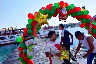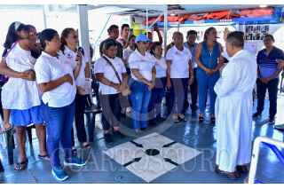 ACAPULCO, GUERRERO, 23DICIEMBRE2023.- El popular Yate Bonanza de Acapulco inicio sus recorridos turísticos nuevamente, después de dos meses que el huracán Otis dañara la embarcación. Las ocho personas de la tripulación qué estaban a bordo lograron sobrevivir, y solo "sufrieron un fuerte susto" como ellos mismo lo mencionaron. Antes del inicio del recorrido un sacerdote hizo una oración y dió la bendición a los trabajadores y a la embarcación. La nave había quedó encallada sobre otras embarcaciones en el Club de Yates, tras el impacto de Otis y pudo ser remolcada. FOTO: CARLOS CARBAJAL/CUARTOSCURO.COM