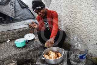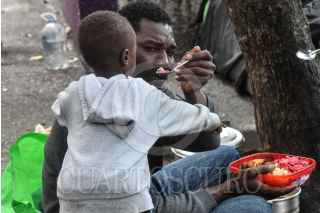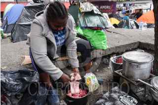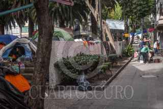 CIUDAD DE MÉXICO, 24DICIEMBRE2023.- En la víspera de navidad, migrantes haitianos preparan sus alimentos en la Plaza Giordano Bruno, denominada "La pequeña Haití” de la colonia Juárez. En la imagen, una familia se abraza a un costado de la plaza. FOTO: MARIO JASSO/CUARTOSCURO.COM