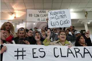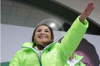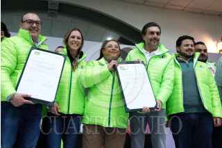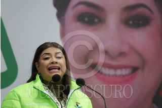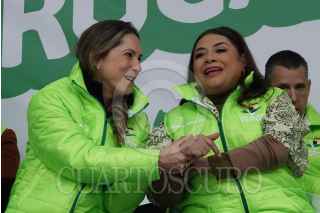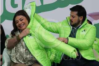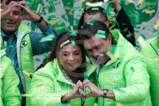 CIUDAD DE MÉXICO, 28DICIEMBRE2023.- Clara Brugada, precandidata por la Jefatura de Gobierno, y Jesús Sesma, secretario general del Partido Verde Ecologista de México, formaron un corazón durante la entrega de constancia de registro como precandidata única del PVEM en el Deportivo Coyuya. FOTO: GRACIELA LÓPEZ /CUARTOSCURO.COM