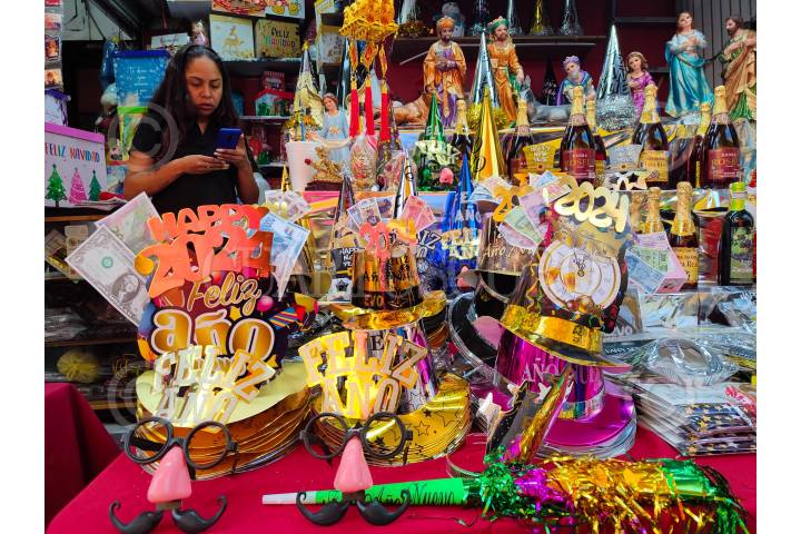 CIUDAD DE MÉXICO, 30DICIEMBRE2O23.- Una comerciante vende artículos en la alcaldía Iztapalapa para festejar el Año Nuevo 2024. FOTO: GRACIELA LÓPEZ /CUARTOSCURO.COM