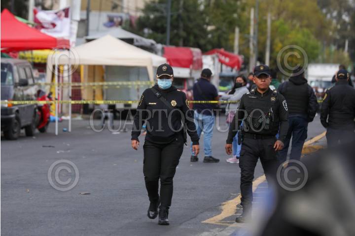 CIUDAD DE MÉXICO, 02ENERO2024.- Una balacera entre presuntos extorsionadores y policías de la Secretaría de Seguridad Ciudadana (SSC) de la Ciudad de México en la alcaldía de Iztacalco, dejó un saldo de dos muertos, siete lesionados, entre ellos un menor de edad, además de 10 hombre detenidos y 5 armas cortas. El hecho ocurrió en una romería que se ubica en la colonia Agrícola Oriental, alcaldía Iztacalco. La SSC detalló mediante una tarjeta informativa que todo ocurrió cuando personal de Inteligencia e Investigación Policial, realizaba trabajos de investigación en seguimiento a denuncias ciudadanas por el delito de extorsión, cuando en la avenida Javier Rojo Gómez y la avenida Sur 16, en la colonia Agrícola Oriental, un grupo de personas realizaron disparos en su contra. FOTO: CUARTOSCURO.COM