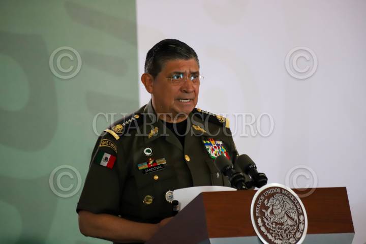 MÉRIDA, YUCATÁN, 03ENERO2023.- Luis Cresencio Sandoval, secretario de la Defensa Nacional, durante la mañanera que se realizó en las instalaciones de la Base Aérea Número 8 de esta ciudad. FOTO: MARTÍN ZETINA/CUARTOSCURO.COM