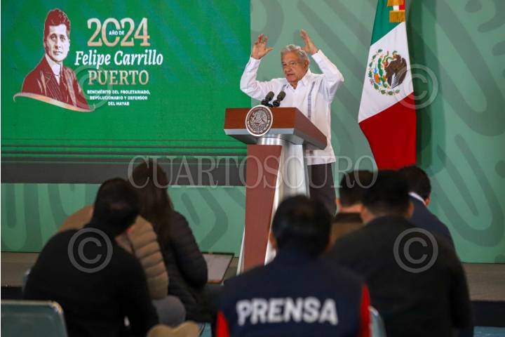 MÉRIDA, YUCATÁN, 03ENERO2023.- El presidente de la República, Andrés Manuel López Obrador, realizó la mañanera en las instalaciones de la Base Aérea Número 8 de esta ciudad. A la conferencia con los medios asistieron el Mauricio Vila Dosal, Gobernador del estado de Yucatán; Luisa María Alcalde Lujan, Secretaria de Gobernación; Rosa Isela Rodríguez Velázquez, Secretaria de Seguridad; Luis Crescencio Sandoval Gonzales, Secretario de la Defensa Nacional; Juan José Padilla Olmos, Jefe del Estado Mayor General; David Córdoba Campos, Comandante de la Guardia Nacional. FOTO: MARTÍN ZETINA/CUARTOSCURO.COM