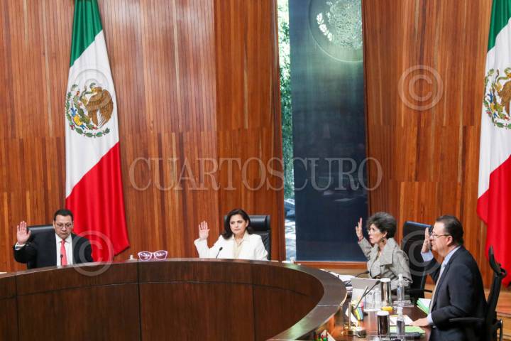CIUDAD DE MÉXICO, 03ENERO2024.- Mónica Soto asumió el cargo como magistrada presidenta del Tribunal Electoral del Poder Judicial de la Federación (TEPJF), en la imagen realizan una votación los magistrados Felipe Fuentes, Janine Otálora y Felipe de la Mata. FOTO: MOISÉS PABLO/CUARTOSCURO.COM