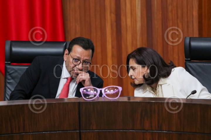 CIUDAD DE MÉXICO, 03ENERO2024.- Felipe Fuentes y Mónica Soto conversan durante la sesión del Tribunal Electoral del Poder Judicial de la Federación (TEPJF), está última asumió el cargo como magistrada presidenta. FOTO: MOISÉS PABLO/CUARTOSCURO.COM