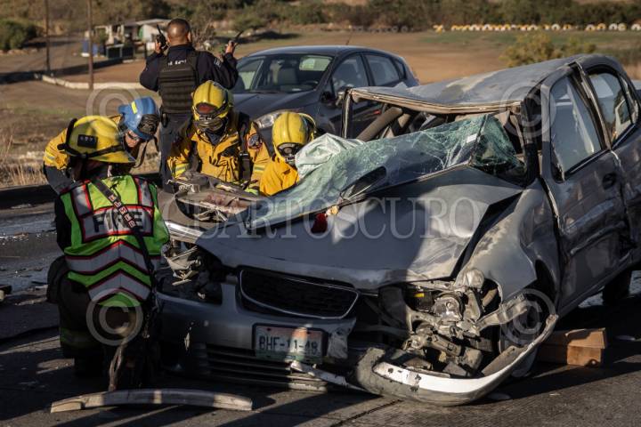TIJUANA, BAJA CALIFORNIA, 04ENERO2024.- El saldo de un accidente vial registrado esta mañana sobre la vía rápida oriente, a la altura de la Planta Tratadora de aguas residuales fue de 5 lesionados y una persona que murió prensada. Al menos 5 vehículos fueron los que se vieron involucrados en este aparatoso accidente, entre ellos un camión de transporte altisa, un auto volkswagen, una camioneta Honda CRV, una Toyota Corola y un Nissan Centra donde quedó prensada la persona. Elementos del cuerpo de bomberos realizaron maniobras de rescate para lograr sacar el cuerpo del hombre que estaba atrapado entre los fierros del asiento del copiloto del automóvil. Paramédicos de la Cruz Roja acudieron al lugar para brindar los primeros auxilios a las otras personas lesionadas, trasladando a una de ellas hacia un hospital para su atención médica. La vialidad fue cerrada en ambos sentidos, al menos por unos 30 minutos, mientras autoridades realizaban las maniobras de rescate de la persona atrapada.FOTO: OMAR MARTÍNEZ /CUARTOSCURO.COM