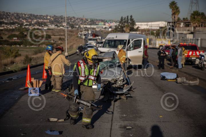 TIJUANA, BAJA CALIFORNIA, 04ENERO2024.- El saldo de un accidente vial registrado esta mañana sobre la vía rápida oriente, a la altura de la Planta Tratadora de aguas residuales fue de 5 lesionados y una persona que murió prensada. Al menos 5 vehículos fueron los que se vieron involucrados en este aparatoso accidente, entre ellos un camión de transporte altisa, un auto volkswagen, una camioneta Honda CRV, una Toyota Corola y un Nissan Centra donde quedó prensada la persona. Elementos del cuerpo de bomberos realizaron maniobras de rescate para lograr sacar el cuerpo del hombre que estaba atrapado entre los fierros del asiento del copiloto del automóvil. Paramédicos de la Cruz Roja acudieron al lugar para brindar los primeros auxilios a las otras personas lesionadas, trasladando a una de ellas hacia un hospital para su atención médica. La vialidad fue cerrada en ambos sentidos, al menos por unos 30 minutos, mientras autoridades realizaban las maniobras de rescate de la persona atrapada.FOTO: OMAR MARTÍNEZ /CUARTOSCURO.COM