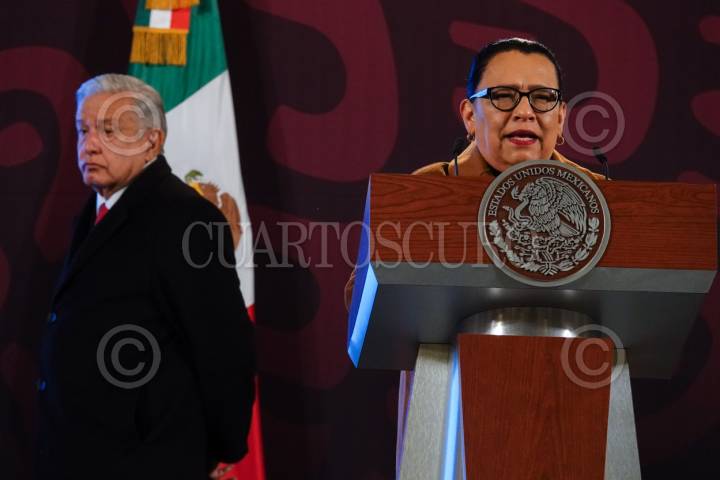 CIUDAD DE MÉXICO, 05ENERO2024.- Andrés Manuel López Obrador, presidente de México y Rosa Icela Rodríguez, secretaria de Seguridad y Protección Ciudadana, durante la mañanera para informar sobre el caso de los 32 migrantes secuestrados en Tamaulipas. FOTO: DENISSE HERNÁNDEZ/CUARTOSCURO.COM