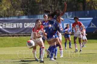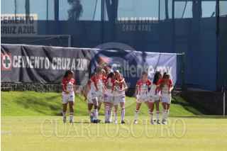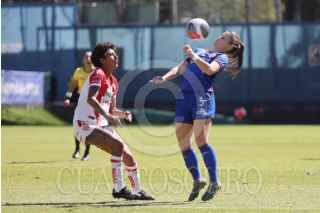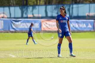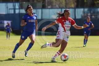 CIUDAD DE MÉXICO, 06ENERO2024. Dayan Fuentes de Necaxa disputa un balón a Meghan Cavanaugh de Cruz Azul durante el partido de fútbol Cruz Azul vs Necaxa correspondiente a la jornada 1 del Torneo Clausura 2024 de Liga BBVA MX Femenil, en instalaciones de La Noria. FOTO: EDGAR NEGRETE/CUARTOSCURO.COM