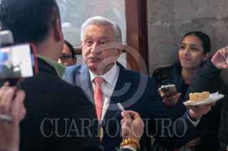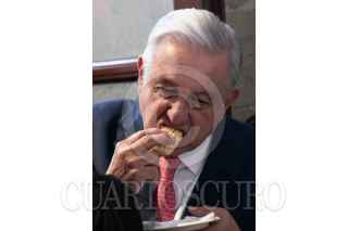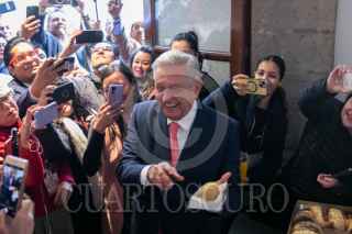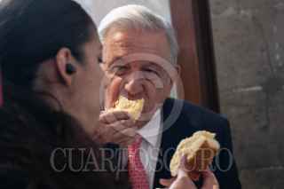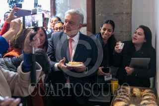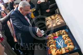 CIUDAD DE MÉXICO, 08ENERO2024.- Andrés Manuel López Obrador, Presidente de México, partió la rosca con reporteros en la sala de prensa junto a reporteros que cubren la mañanera, el mandatario mostró su rebanada para demostrar que no le tocó el muñeco y comprometió a los periodistas que si se lo sacaron a traer los tamales el Día de la Candelaria. FOTO: MOISÉS PABLO/CUARTOSCURO.COM