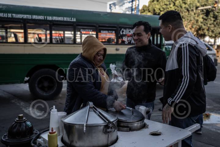 TIJUANA, BAJA CALIFORNIA, 08ENERO2024.- En las últimas horas, tijuanenses han experimentado un marcado descenso en las temperaturas, alcanzando niveles tan bajos como 3 grados centígrados en la zona este de la ciudad. El clima helado ha llevado a que los ciudadanos tomen medidas para afrontar esta situación derivada del frente frío 25 presente en la región. En las calles, se observa a la población salir de sus hogares abrigados, cubriéndose de las inclemencias climáticas, principalmente en la Zona Centro se puede ver gente consumiendo bebidas y alimentos calientes para meguar las bajas temperaturas. La población más vulnerable de todas son las personas en condición de calle, que no tienen dónde refugiarse ante las bajas temperaturas. FOTO: OMAR MARTÍNEZ /CUARTOSCURO.COM