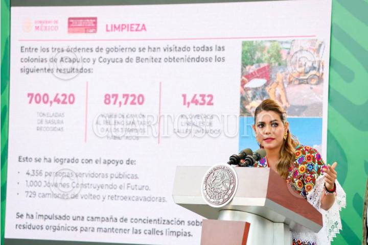 ACAPULCO, GUERRERO, 10ENERO2024.- Evelyn Salgado, gobernadora de Guerrero, durante la presentación del Plan General de Reconstrucción y Apoyo a la Población en Acapulco y Coyuca de Benítez por el paso del huracán Otis, en la mañanera que en esta ocasión se realizó en la zona naval de este puerto. FOTO: PRESIDENCIA/CUARTOSCURO.COM