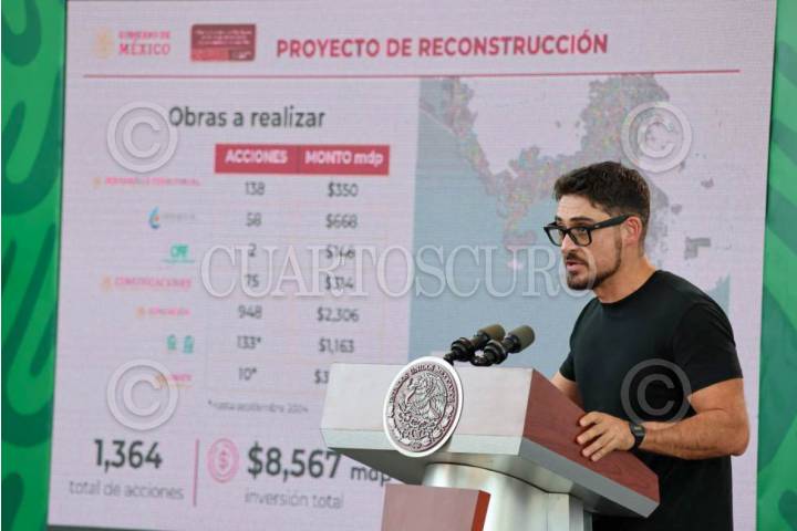 ACAPULCO, GUERRERO, 10ENERO2024.- Román Meyer Falcón, secretario de Desarrollo Agrario, Territorial y Urbano; durante la presentación del Plan General de Reconstrucción y Apoyo a la Población en Acapulco y Coyuca de Benítez por el paso del huracán Otis, en la mañanera que en esta ocasión se realizó en la zona naval de este puerto. FOTO: PRESIDENCIA/CUARTOSCURO.COM