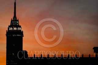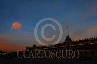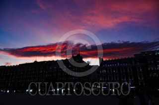 CIUDAD DE MÉXICO, 11ENERO2024.- Aspectos del atardecer multicolor cubriendo los edificios de la periferia del Zócalo Capitalino. FOTOS: ROGELIO MORALES /CUARTOSCURO.COM