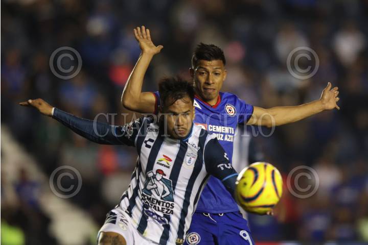 CIUDAD DE MÉXICO, 13ENERO2024. Sergio Barreto y Ángel Sepúlveda disputan una pelota durante el partido de fútbol Cruz Azul vs Pachuca correspondiente a la jornada 2 del Torneo Clausura 2024 de Liga BBVA MX, en el Estadio Ciudad de los Deportes. FOTO: EDGAR NEGRETE LIRA/CUARTOSCURO.COM