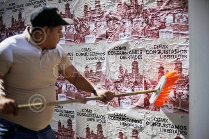 CIUDAD DE MÉXICO, 14ENERO2023.- Sebastián Ramírez, dirigente local de Morena en la capital, encabezó la pega en bardas de carteles con la campaña que busca impulsar el proyecto político del partido, la cual lleva leyendas como: "CDMX Crearon Utopías" y "CDMX Empezó la Transformación", el arranque de esta iniciativa tuvo lugar en calles de la colonia Roma. FOTO: CUARTOSCURO.COM
