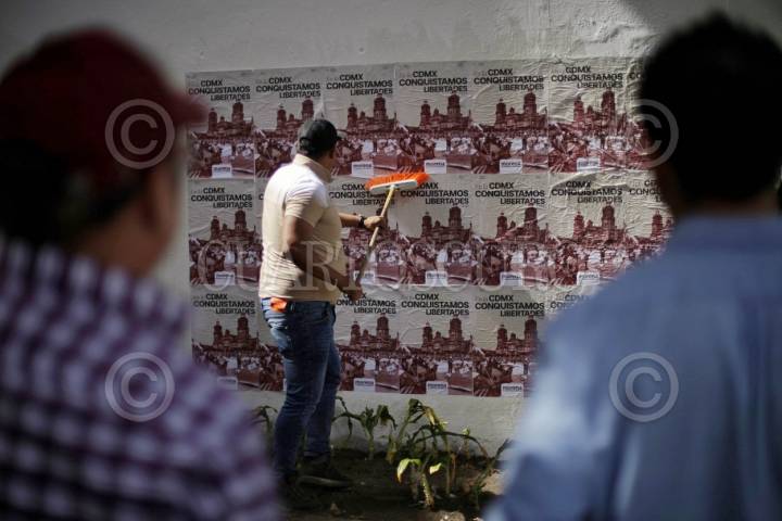 CIUDAD DE MÉXICO, 14ENERO2023.- Sebastián Ramírez, dirigente local de Morena en la capital, encabezó la pega en bardas de carteles con la campaña que busca impulsar el proyecto político del partido, la cual lleva leyendas como: "CDMX Crearon Utopías" y "CDMX Empezó la Transformación", el arranque de esta iniciativa tuvo lugar en calles de la colonia Roma. FOTO: CUARTOSCURO.COM