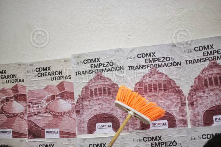 CIUDAD DE MÉXICO, 14ENERO2023.- Sebastián Ramírez, dirigente local de Morena en la capital, encabezó la pega en bardas de carteles con la campaña que busca impulsar el proyecto político del partido, la cual lleva leyendas como: "CDMX Crearon Utopías" y "CDMX Empezó la Transformación", el arranque de esta iniciativa tuvo lugar en calles de la colonia Roma. FOTO: CUARTOSCURO.COM