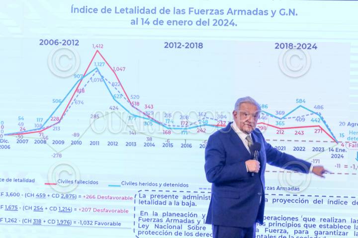 CIUDAD DE MÉXICO, 15ENERO2024.- Andrés Manuel López Obrador, Presidente de México, muestra una gráfica en donde destacó que la tasa de letalidad en su sexenio es menor en los operativos de seguridad del Ejército y Guardia Nacional, durante la mañanera. FOTO: MOISÉS PABLO/CUARTOSCURO.COM