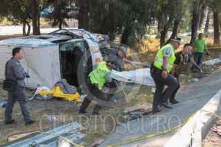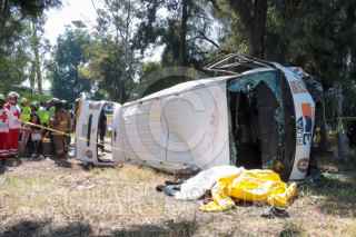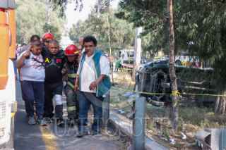 TLALNEPANTLA, ESTADO DE MÉXICO, 16ENERO2024.- Una combi del transporte público sufrió una volcadura luego de que el chófer supuestamente se infarta y muriera, por lo que perdió el control de su unidad, el incidente dejo un saldo de 17 heridos. Los hechos en la carretera México-Pachuca, a la altura de la colonia el Vigilante. FOTO: ROGELIO MORALES/CUARTOSCURO.COM