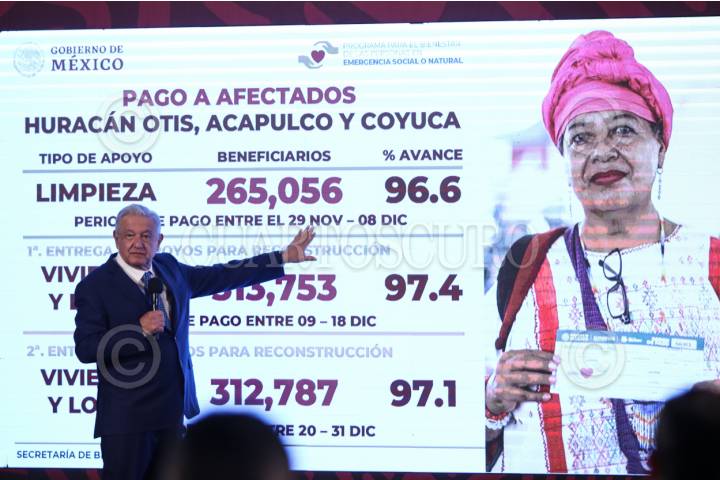 CIUDAD DE MÉXICO, 17ENERO2024.-Andrés Manuel López Obrador, presidente de México muestra cifras de apoyo a damnificados del Huracán Otis durante la conferencia de prensa en Palacio Nacional. FOTO: ANDREA MURCIA /CUARTOSCURO.COM