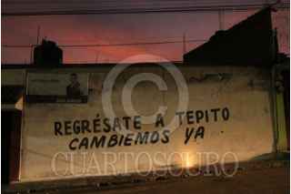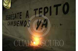 CUERNAVACA, MORELOS, 18ENERO2024.- En la zona poniente de la capital del estado varias bardas han sido pintadas de blanco con las leyendas: "Regrésate a Tepito, cambiemos ya" con una clara alusión al gobernador Cuauhtémoc Blanco Bravo. En la imagen, dos veladoras alumbran el sitio donde el pasado lunes por la mañana un hombre de 35 años, que trabajaba como tatuador, fue asesinado tras dejar a su hijo en el kínder, esto ocurrió en la colonia Lagunilla, una de las zonas con mayor violencia social. FOTO: MARGARITO PÉREZ RETANA/CUARTOSCURO.COM