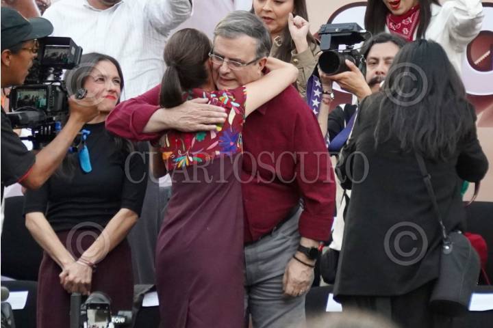 CIUDAD DE MÉXICO, 18ENERO2024.- Claudia Sheinbaum saluda a Marcelo Ebrard momentos antes del inicio de su mitin en donde cerró su precampaña Presidencial en el Monumento a la Revolución. FOTO: ELIZABETH RUIZ/CUARTOSCURO.COM