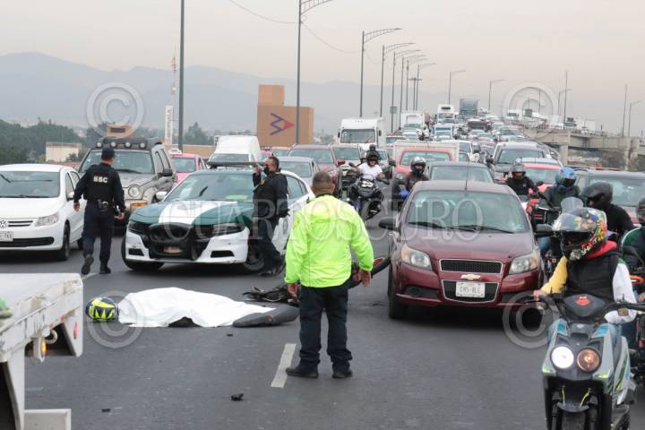 CIUDAD DE MÉXICO, 19ENERO2024.- Una mujer que se desempeñaba como elemento de la Policía de Investigación (PDI) de la Fiscalía General de Justicia de la Ciudad de México, murió mientras circulaba sobre el distribuidor vial Heberto Castillo. La joven de 25 años cayó de la motocicleta y fue aplastada por una unidad de carga pesada. Elementos de seguridad pública acudieron a la alcaldía Venustiano Carranza para el levantamiento del cuerpo. FOTO: ROGELIO MORALES/CUARTOSCURO.COM