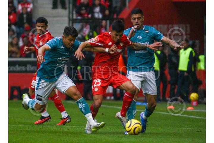 TOLUCA, ESTADO DE MÉXICO, 20ENERO2024.- Claudio Baeza medio de Diablos de Toluca pelea el esférico Bryan Colula Defensa de Mazatlán, durante el partido de la jornada 2 del Torneo Clausura 2024 de la Liga MX, el encuentro tuvo un marcador final 4-1 a favor del equipo escarlata. FOTO: CRISANTA ESPINOSA AGUILAR /CUARTOSCURO.COM