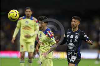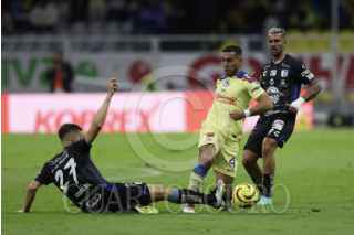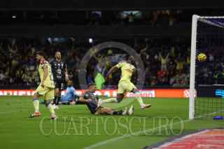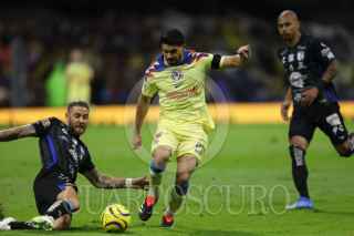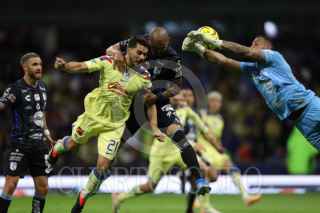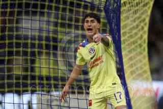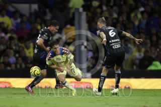 CIUDAD DE MÉXICO, 20ENERO2024. Alejandro Zendejas y Julián Quiñones felicitan a su compañero Richard Sánchez tras su anotación durante el partido de fútbol América vs Querétaro correspondiente a la jornada 2 del Torneo Clausura 2024 de Liga BBVA MX, en el Estadio Azteca. FOTO: EDGAR NEGRETE LIRA/CUARTOSCURO.COM