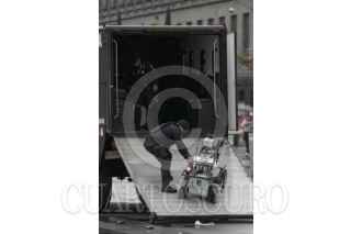 CIUDAD DE MÉXICO, 21ENERO2024.- Policías de la Secretaría de Seguridad Ciudadana resguardan el robot especializado para emergencias en explosivos cuando empezó a llover en el Zócalo, en donde se encontraba para una exposición, en el marco de las actividades que se llevaron a cabo este fin de semana en el primer cuadro para celebrar su peatonalización. FOTO: MOISÉS PABLO/CUARTOSCURO.COM
