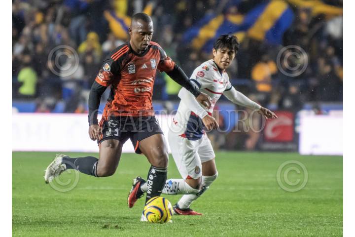 SAN NICOLÁS DE LOS GARZA, NUEVO LEÓN, 21ENERO2024.- Samir De Souza de Tigres, se disputa el balón con José Macías del Guadalajara, en el estadio Universitario, partido correspondiente a la jornada 2 de la Clausura 2024 de la Liga Mx. Marcador Final: Tigres: 1 - Guadalajara: 0. FOTO: CUARTOSCURO.COM