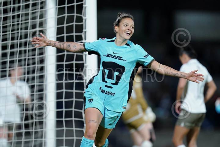 CIUDAD DE MÉXICO, 23ENERO2024.- El equipo femenil de los Pumas se impuso por 2-1 al de las Bravas del Futbol Club Juárez, para alcanzar así su primera victoria en el Clausura 2024 de la Liga MX Femenil. Las auriazules volvieron a la senda de la victoria en el Estadio Olímpico Universitario -después de haber caído en sus dos anteriores encuentros oficiales en casa, ambos contra Tigres- y arribaron así a cuatro unidades después de cuatro jornadas disputadas en la campaña. En la imagen Stephanie Ribeiro festeja el segundo gol de las universitarios. FOTO: PRENSA CLUB PUMAS/CUARTOSCURO.COM