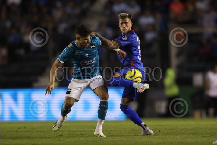 CIUDAD DE MÉXICO, 27ENERO2024. Luis Amarilla de Mazatlán y Gonzalo Piovi de Cruz Azul disputan una pelota durante el partido de fútbol Cruz Azul vs Mazatlán correspondiente a la jornada 3 del Torneo Clausura 2024 de Liga BBVA MX, en el Estadio Ciudad de los Deportes. FOTO: EDGAR NEGRETE LIRA/CUARTOSCURO.COM