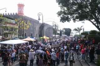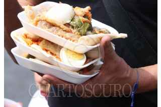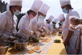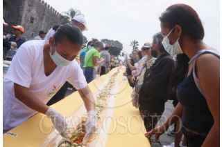 CUERNAVACA, MORELOS, 28ENERO2024.- El ayuntamiento de la capital convoco a escuelas de gastronomía, restauranteros y empresarios de la tortilla para imponer el récord mundial del taco acorazado más largo. Decenas de personas se reunieron en la explanada del Palacio de Cortes para participar en la elaboración del taco que llevo una base de arroz y guisados diversos, el taco alcanzo una longitud de 78 metros, superando la anterior marca de 70 metros que impuso esta ciudad el año pasado. FOTO: MARGARITO PÉREZ RETANA/CUARTOSCURO.COM