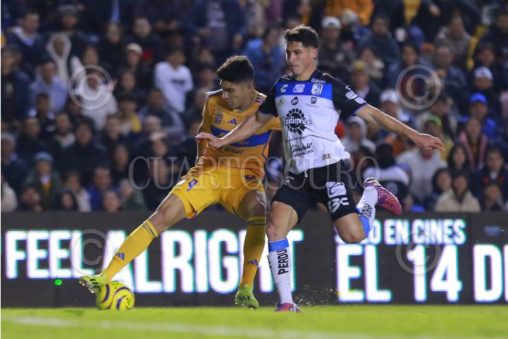 QUERÉTARO, QUERÉTARO, 29ENERO2024.- Nicolas Ibanez del Tigres y Pablo Ortiz del Queretaro, durante el juego entre Queretaro y Tigres de la jornada 3 del Torneo Clausura 2024 de la Liga MX, celebrado en el estadio Corregidora con marcador final de empate a uno. FOTO: CÉSAR GÓMEZ/CUARTOSCURO.COM